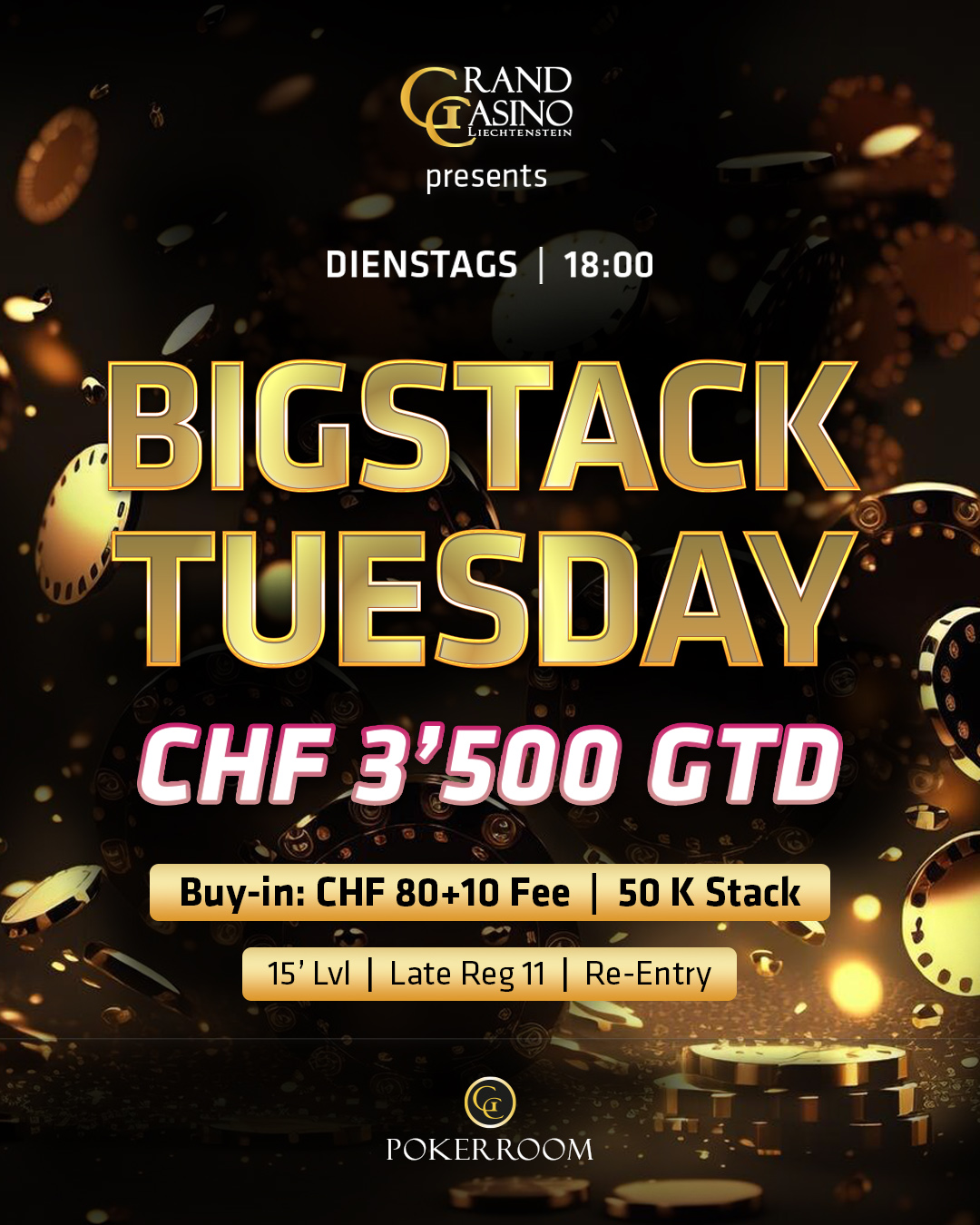 | 18:00 | Bigstack Tuesday | 90CHF (80+10) | 3.500CHF | 15 | 0 | Scheduled | ![]() |