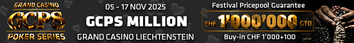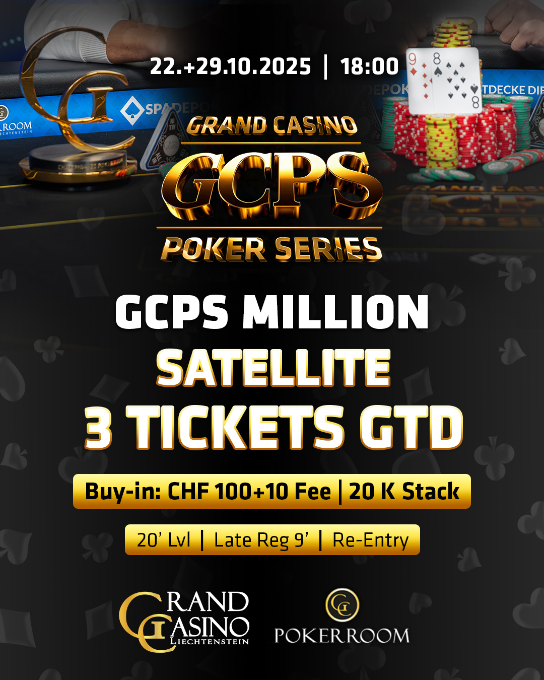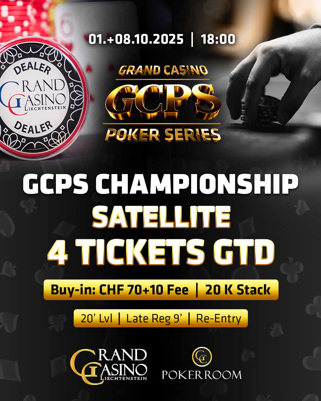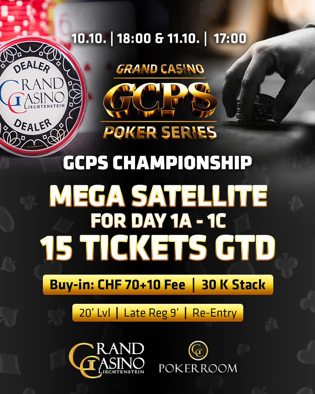 18:00 | Mega Satellite - GCPS Championship 1A-1C | 80CHF (70+10) | 8.250CHF | 20 | 0 | Scheduled | ![]() |