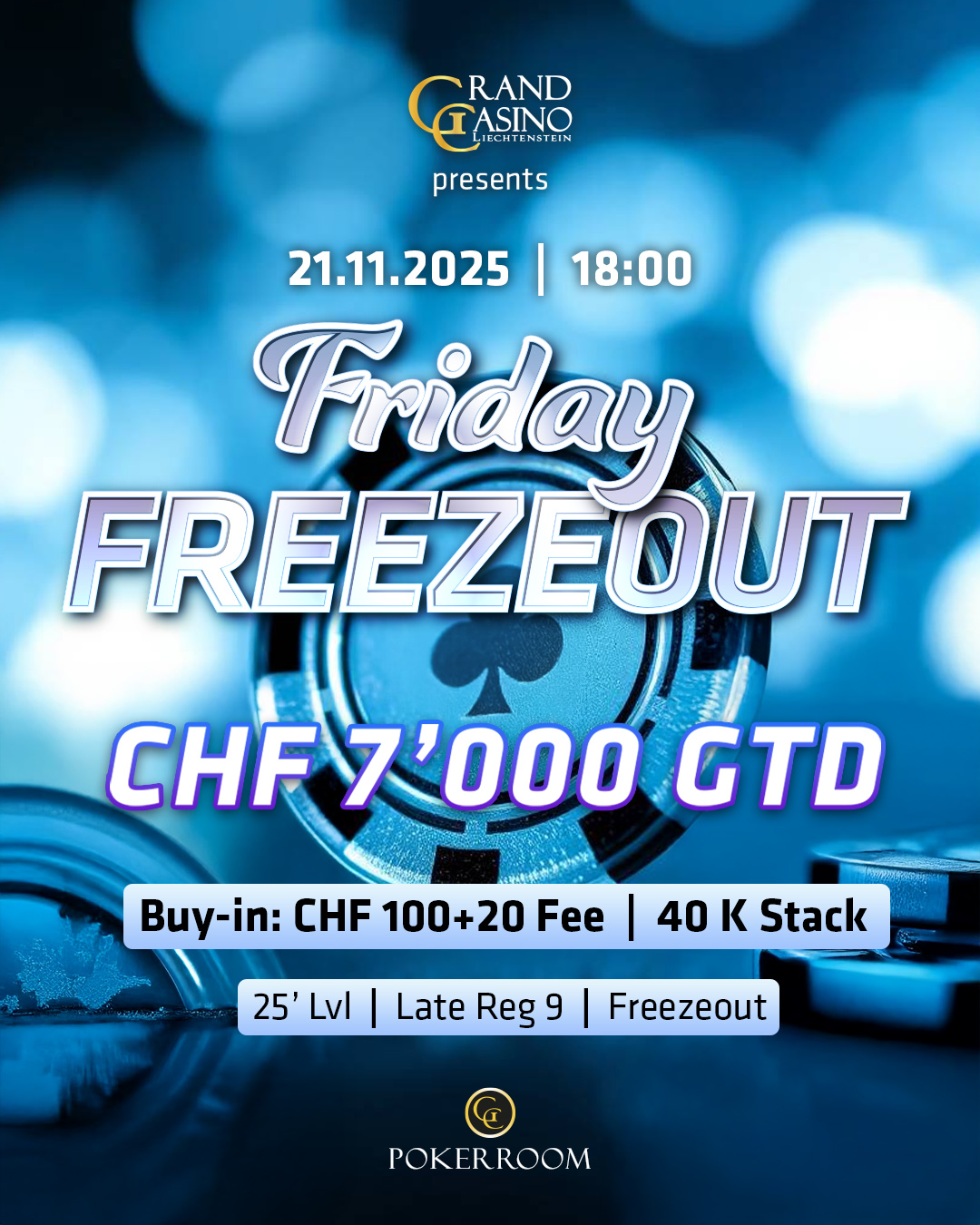 | 20:00 | NLH Freezeout | 150CHF (80+50+20) | 🏆 | 20 | 0 | Scheduled | ![]() |