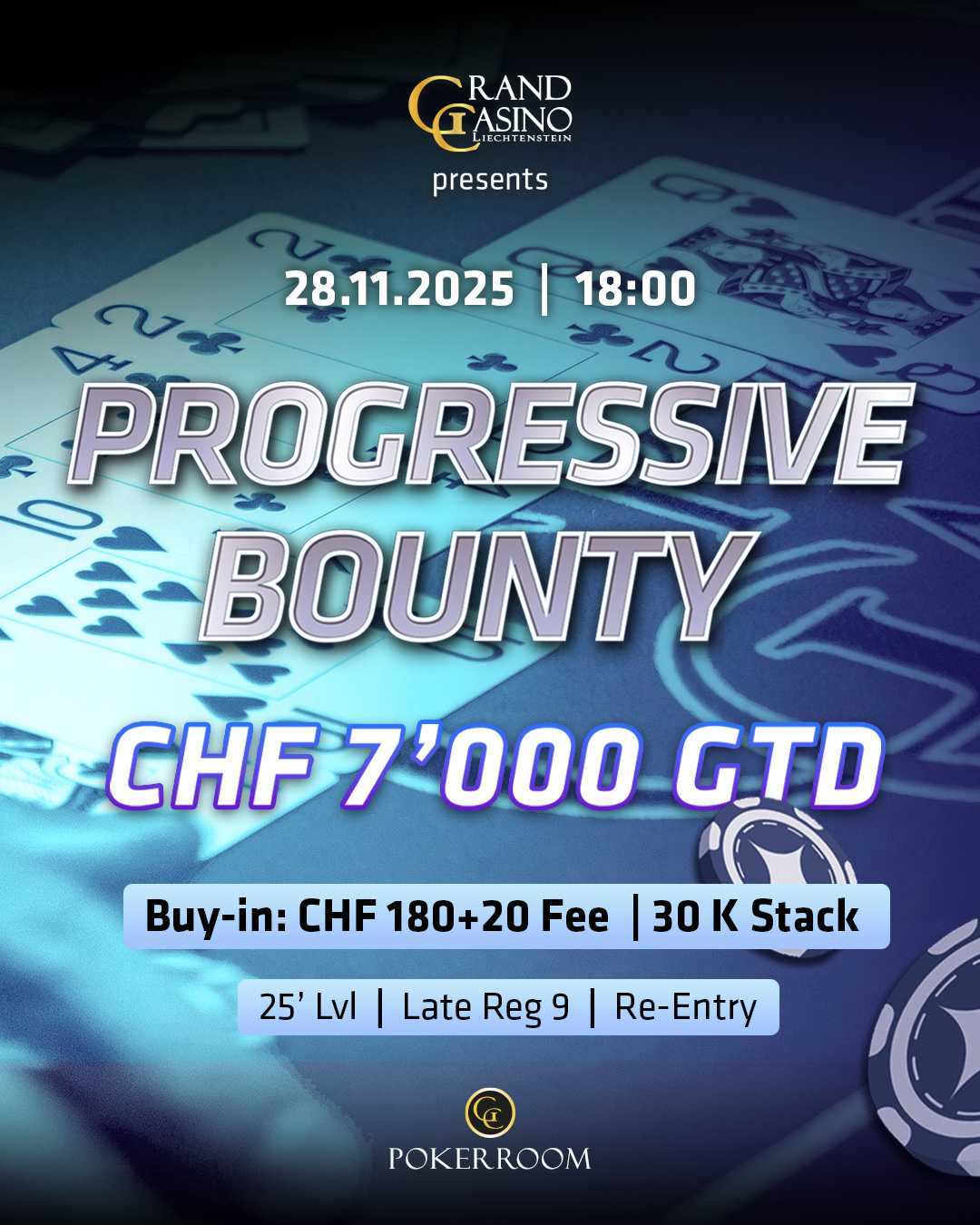 | 18:00 | Progressive Bounty | 200CHF (100+80+20) | 7.000CHF | 25 | 0 | Scheduled | ![]() |