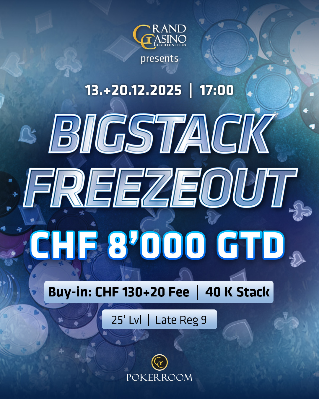 | 17:00 | Bigstack Freezeout | 150CHF (130+20) | 8.000CHF | 25 | 0 | Scheduled | ![]() |