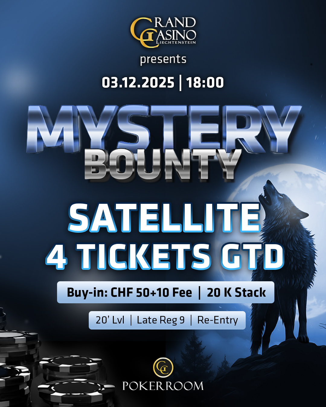 | 18:00 | Mystery Bounty Satellite | 60CHF (50+10) | 1.320CHF | 20 | 0 | Scheduled | ![]() |