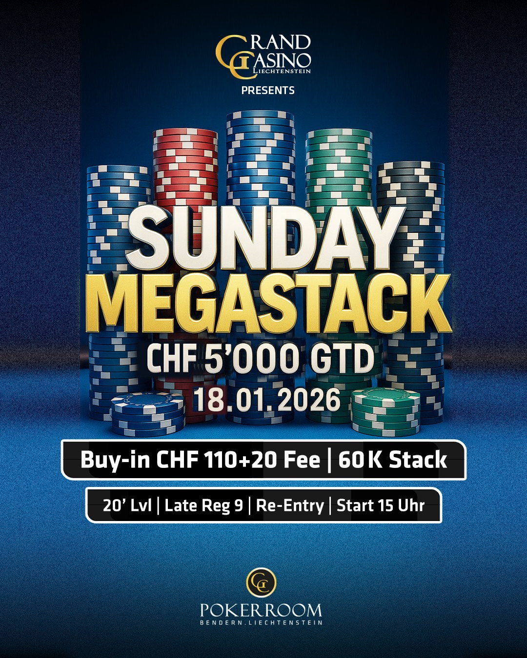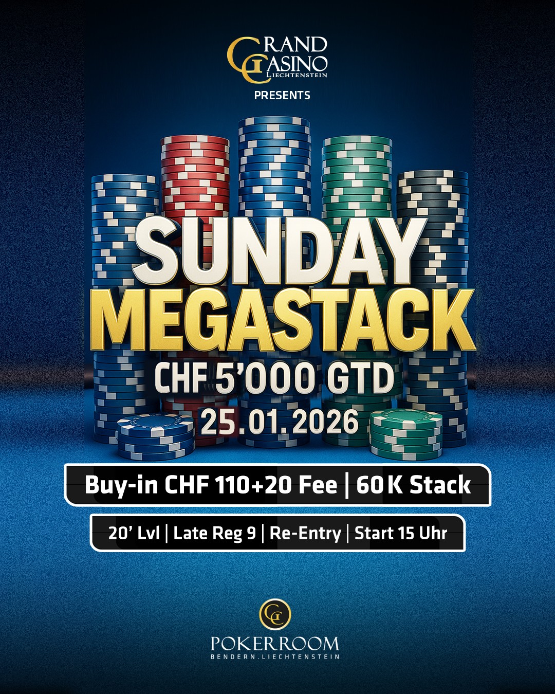 | 15:00 | Sunday Megastack | 130CHF (110+20) | 5.000CHF | 20 | 0 | Scheduled | ![]() |
