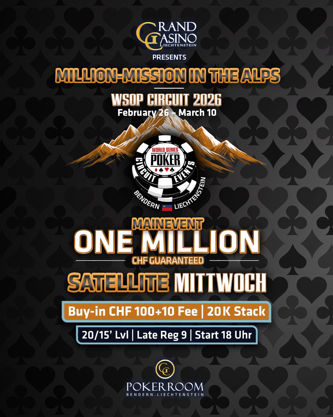 | 18:00 | WSOP Circuit Satellite | 110CHF (100+10) | 3.000CHF | 20/15 | 0 | Scheduled | ![]() |
